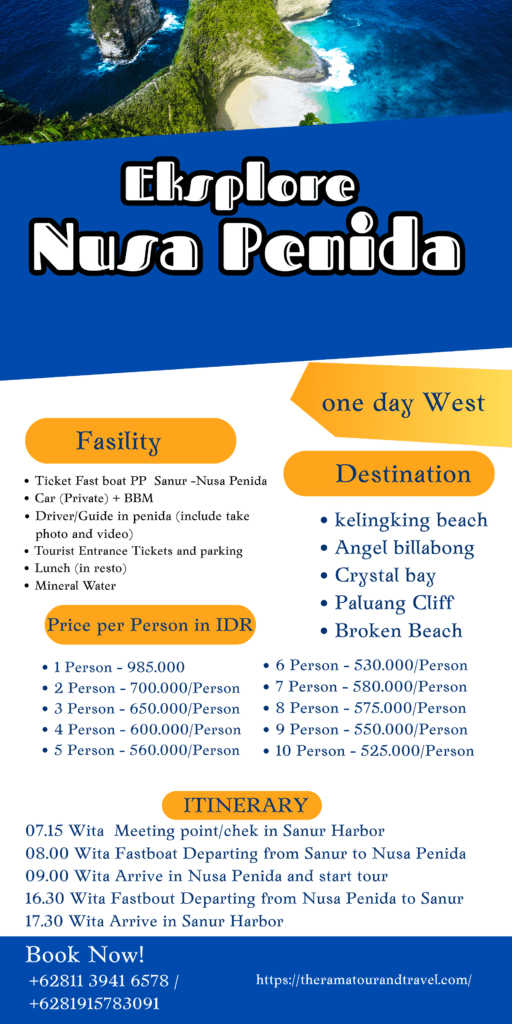 1 Day West in nusa penida Destination: kelingking beach Angel billabong Crystal bay Paluang Cliff Broken Beach All packages include: Ticket Fast boat PP Sanur -Nusa Penida Car (Private) + BBM Driver/Guide in penida (include take photo and video) Tourist Entrance Tickets and parking Lunch (in resto) Mineral Water